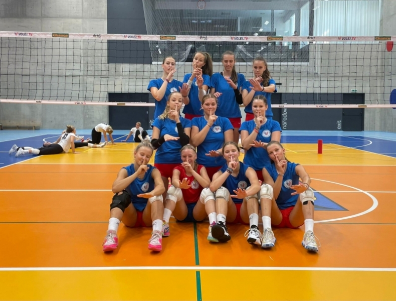 Nikča Fojtová (v horní řadě druhá zleva) je stále naší hráčkou, i když nyní hájí barvy Národního volejbalového centra na Kladně. A my samozřejmě rádi vidíme, když se jí a jejímu týmu daří... Jen tak dál... ????